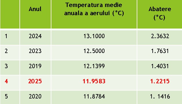 Datele Administrației Naționale de Meteorologie indică faptul că anul 2025 a fost caracterizat de fenomene meteorologice extreme, inclusiv caniculă, secetă severă și precipitații intense, confirmând o tendință accelerată de încălzire și o variabilitate crescută a vremii. Anul 2025 a fost al patrulea cel mai cald din perioada 1901-prezent, cu o temperatură medie anuală de 11,95°C, înregistrând o abatere pozitivă de +1,22°C față de media din perioada 1991-2020.